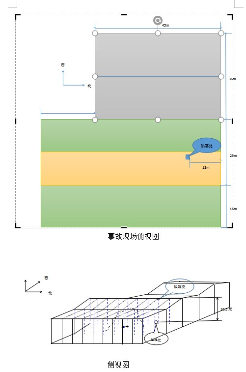2020年3月2日,调查组人员对篱笆镇骆庙村胡**黄沙销售点事故现场进行了勘验。1、事故发生处棚高约10.5米,距离北侧边缘12米,其下方为空地,空地南侧为石子堆;2、钢构大棚总面积4203平方,在建面积约1600平方。钢构棚最高处高10.5米,边缘立柱高8.6米,脊梁间距1米;3、顶部采用彩钢瓦铺设,彩钢瓦每片长16米、宽0.8米,彩钢瓦与型梁搭接处采用铆固措施;4、发生坠落洞口南侧约20cm处有一铆钉机,洞口处及北侧至边缘彩钢瓦与脊梁搭接,未铆固;5、事故现场未搭设脚手架,未发现安全带、安全网等防护设施。