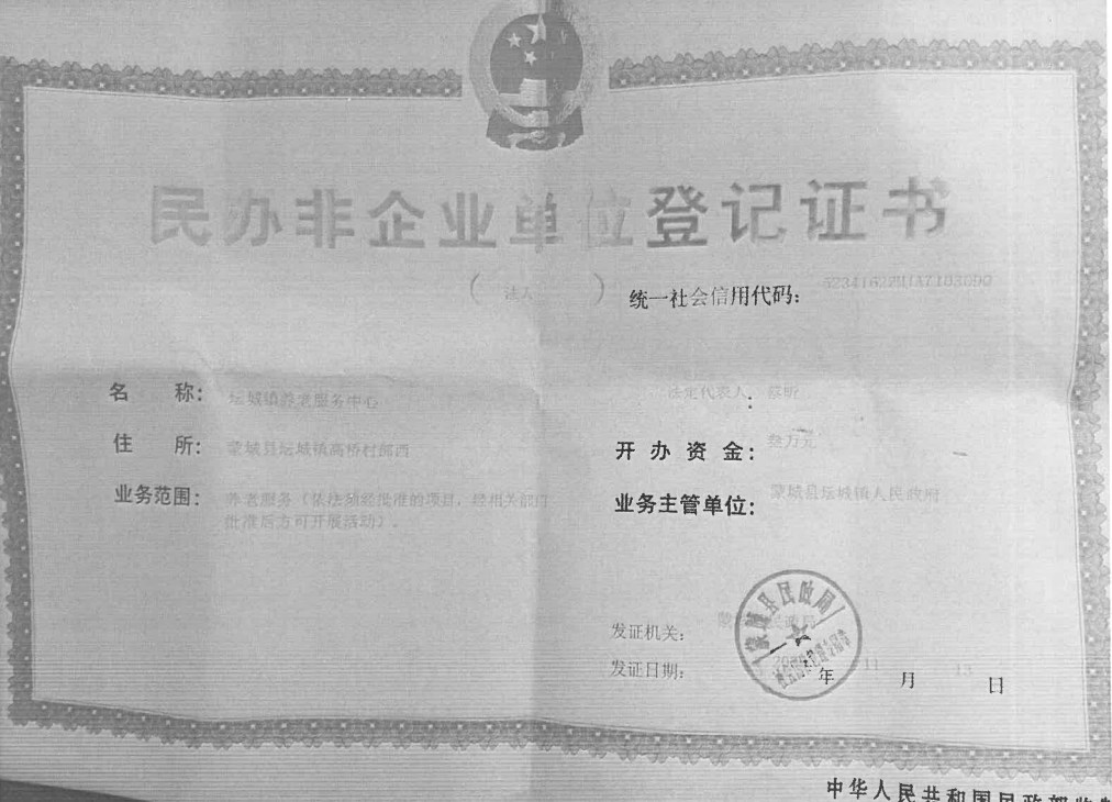 坛城镇养老服务中心登记证书