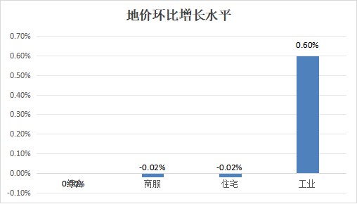 从监测结果数据来看,综合用地地价同比增长率为-0.58%,其中商服用地地价增长率为-0.19%;住宅用地地价增长率为-0.47%;工业用地地价增长率为0%。商服地价水平和住宅地价水平逐步下降,工业用地地价水平与上年同期持平(详见图3)。