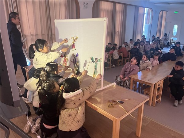 非遗体验环节同样精彩纷呈。馆员老师通过皮影戏这一国家级非物质文化遗产,演绎了《西游记》经典片段《三打白骨精》。孩子们被幕布上灵动的皮影人物深深吸引,在老师的讲解下了解了皮影戏的历史与制作工艺,并纷纷上台尝试操作皮影,亲身体验传统文化的魅力。