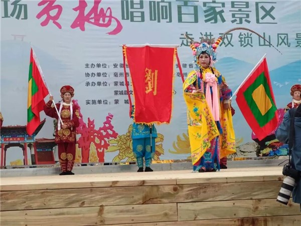 10月7日下午, 由安徽省文化和旅游厅主办,蒙城县文化旅游体育局、蒙城县文化体育事业发展中心承办,蒙城县文化馆实施的“百场黄梅唱响百家景区”走进小涧双锁山景区演出活动圆满举行。黄梅戏领衔、梆子戏助阵的戏曲专场演出,让黄梅进景区活动展现出鲜活的神韵与魅力。