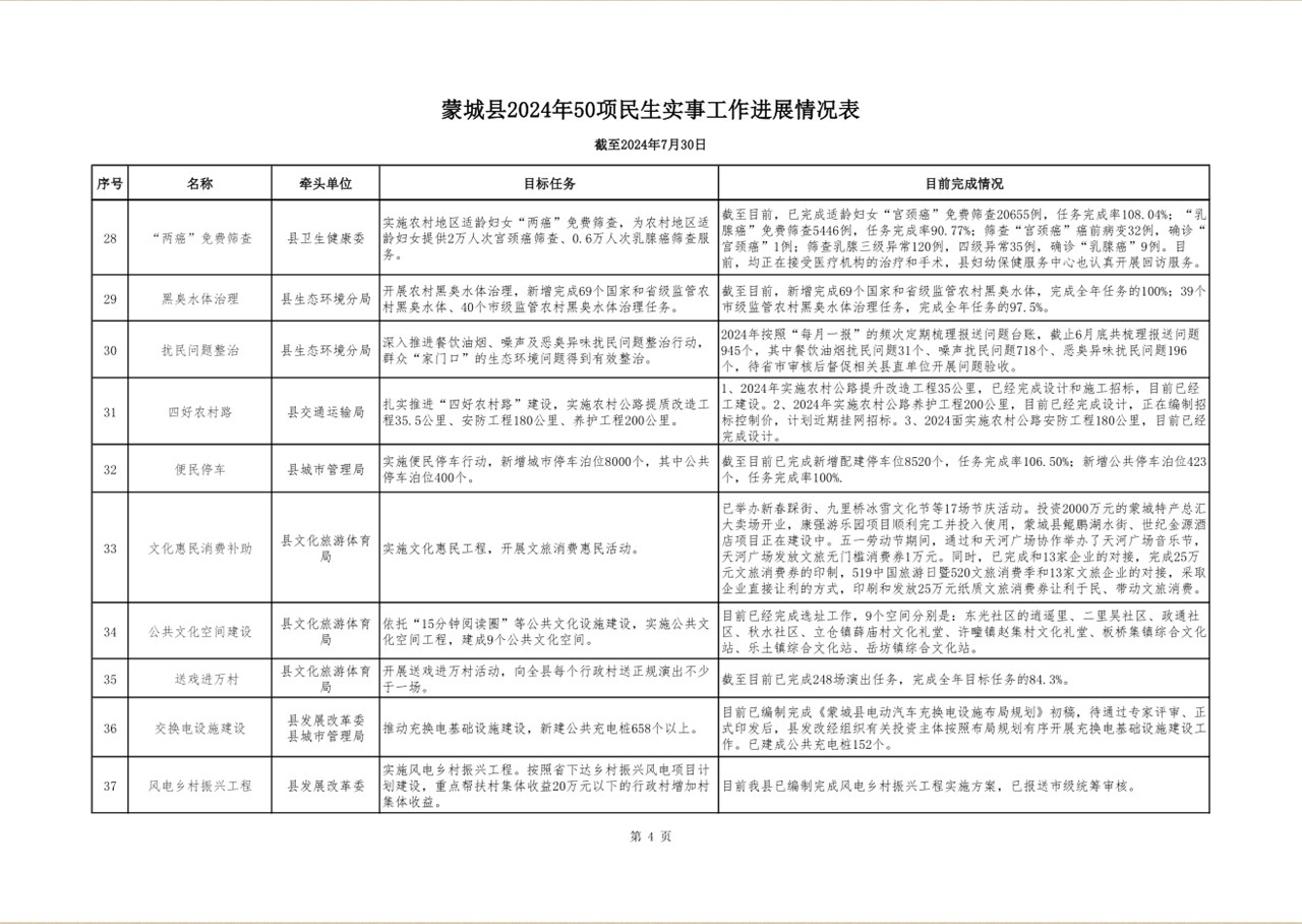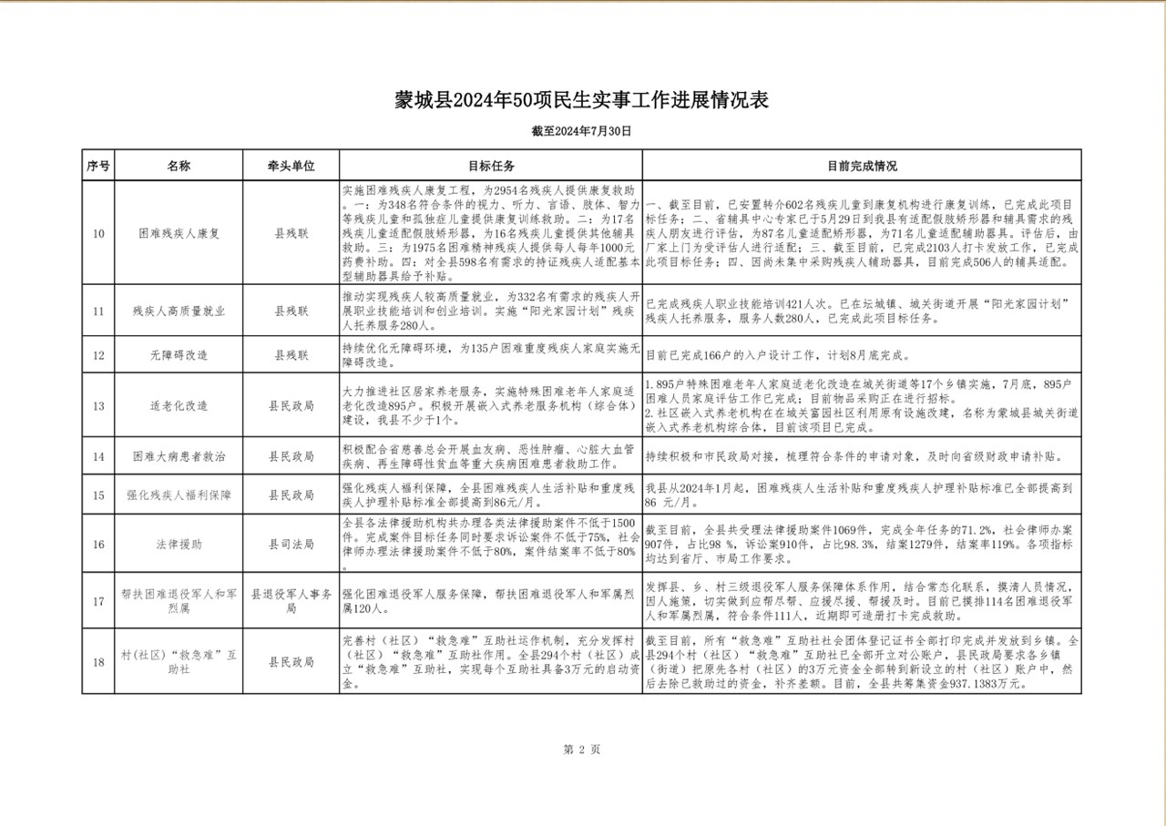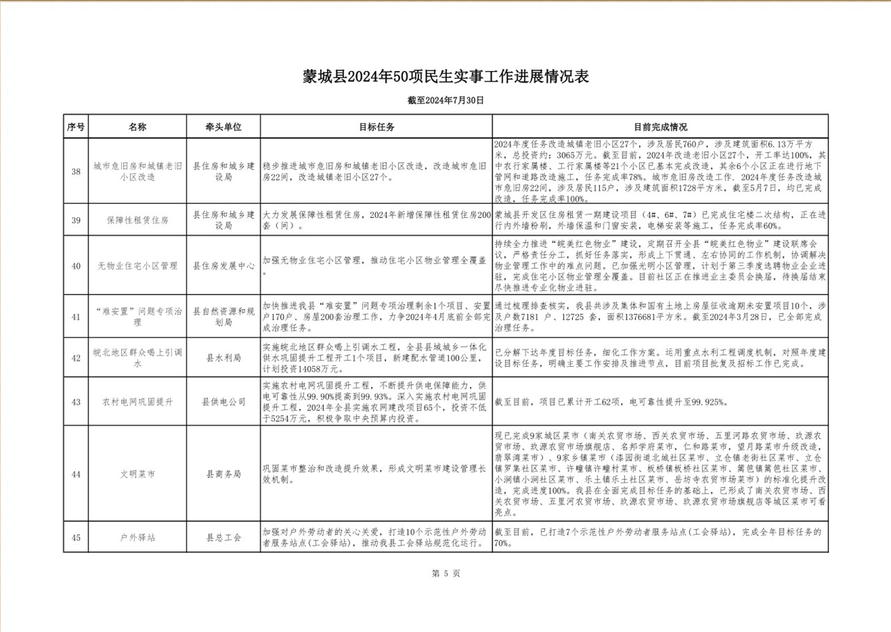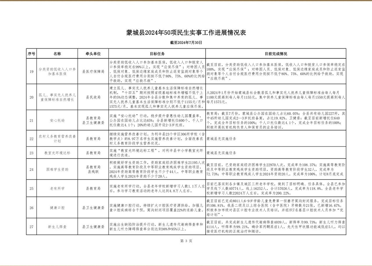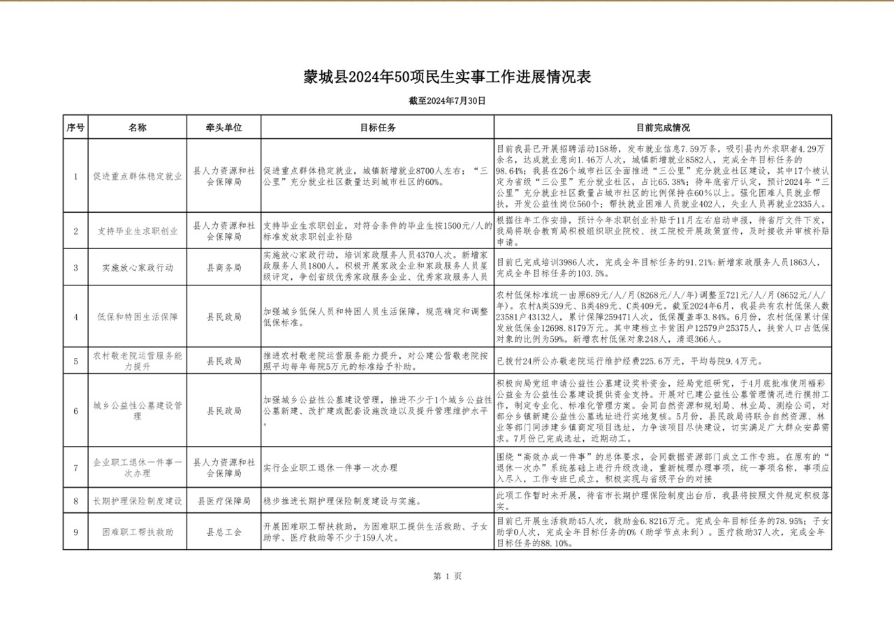 蒙城县2024年1-7月份50项民生实事工作进展