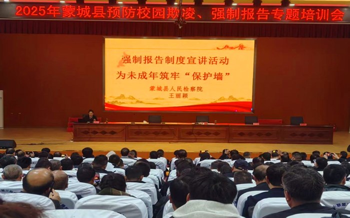 10月23日,蒙城县教育局联合县公安局、县检察院、县人社局开展预防校园欺凌、强制报告专题培训会。会上邀请县公安局治安管理大队治安中队队长薛振峰对预防校园欺凌进行专题培训,县人民检察院未检办检察官助理王丽颖就强制报告专题培训。全县各中小学校分管校长、具办人、班主任代表及全县各派出所分管领导400余人参会。会议由蒙城县委教育工委委员曹愿主持。