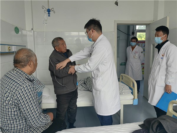 上午11点30分义诊结束后,李伟副书记带领专家团队并未停歇,而是径直走进楚村镇中心卫生院住院病房。每到一间病房,专家们都认真查看患者病历,俯身询问患者恢复情况,仔细检查伤口、查看各项检查报告,与管床医生深入交流当前治疗方案。针对一位慢性阻塞性肺疾病患者,呼吸与重症医学科李伟、周晓宇专家共同会诊,结合患者病情调整了用药方案,并叮嘱医护人员“要密切关注患者血氧饱和度变化,指导其正确进行呼吸功能锻炼”;在心血管内科患者病房,陈耀专家详细讲解了冠心病患者术后护理的关键要点,为患者和家属吃下“定心丸”。