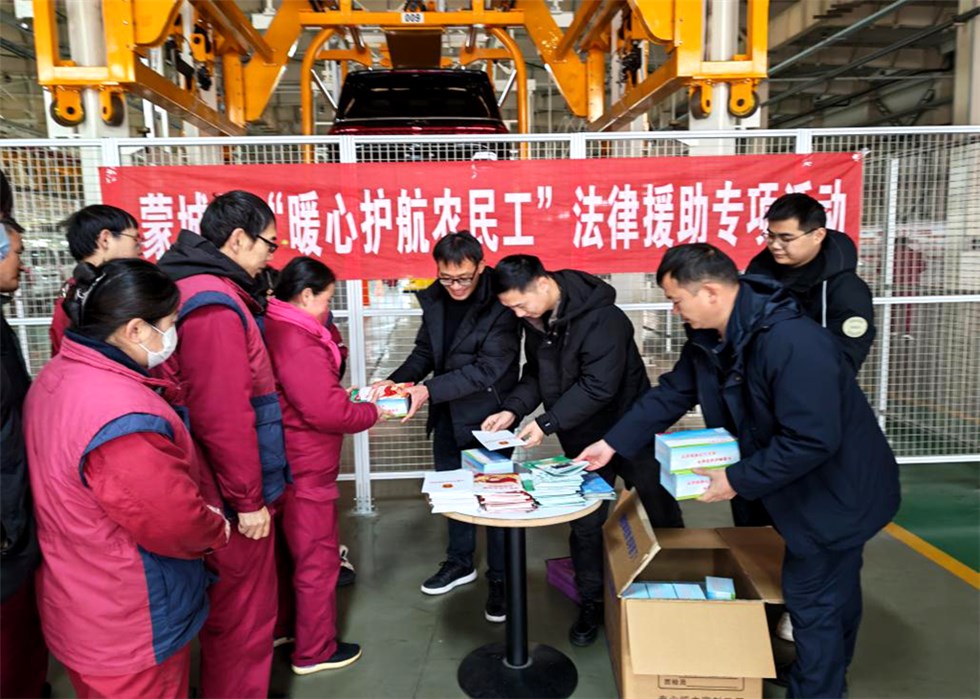 为进一步提升农民工法治观念和依法维权能力,畅通农民工法律援助服务渠道,12月24日上午,蒙城县司法局与县人社局联合组建法律服务队,深入蒙城县万隆汽车零部件有限公司和安徽江淮安驰汽车有限公司,集中开展“暖心护航农民工”法律援助专项行动。