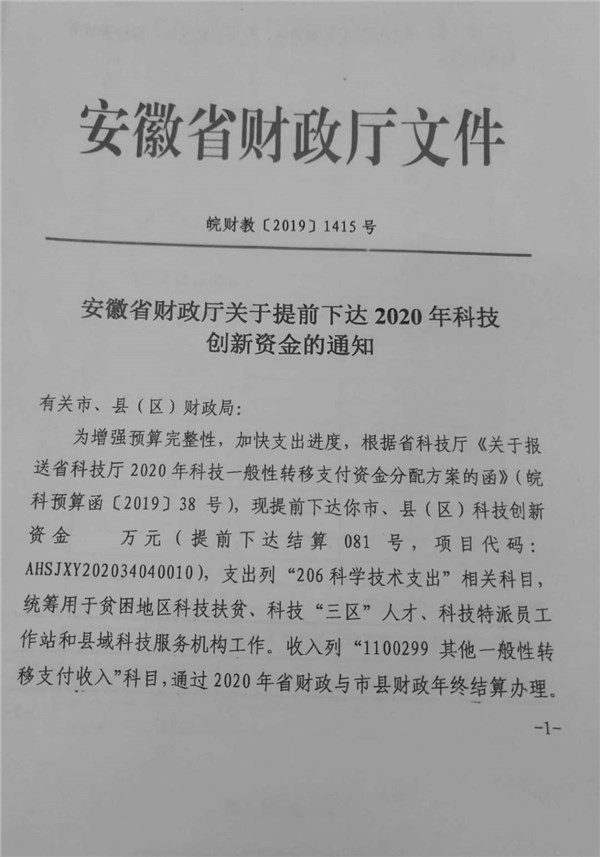 | 名称: | 安徽省财政厅关于提前下达2020年科技创新资金的通知 |