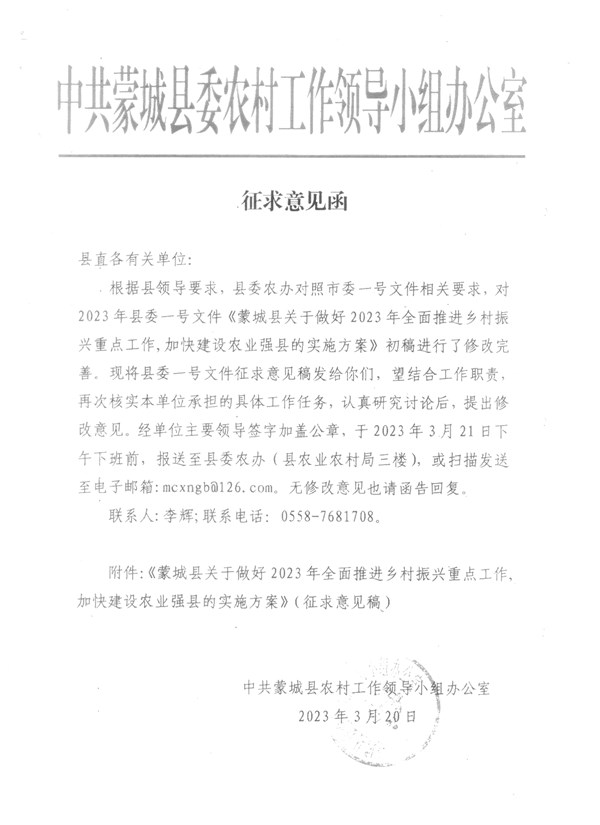 | 名称: | 《蒙城县关于做好2023年全面推进乡村振兴重点工作加快建设农业强县的实施方案》征求意见函 |