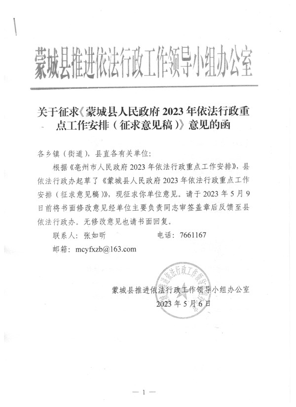 | 名称: | 关于征求〈蒙城县人民政府2023年依法行政重点工作安排(征求意见稿)〉 意见的函 |