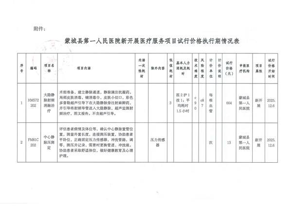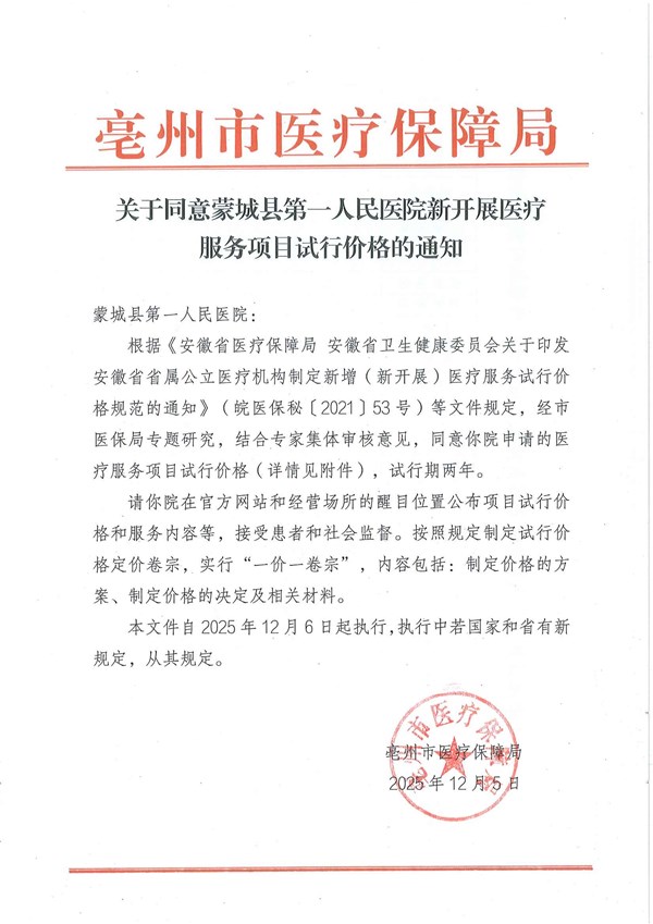 | 名称: | 关于同意蒙城县第一人民医院新开展医疗服务项目试行价格的通知 |