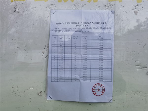 | 名称: | 庄周街道马店社区2026年1月份惠民惠农补贴资金发放公示情况 | 文号: | 无 |