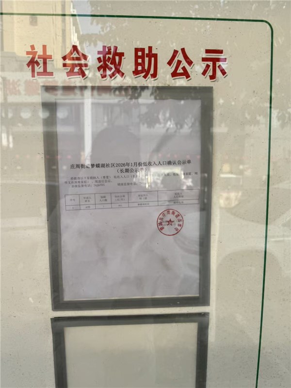 | 名称: | 庄周街道梦蝶湖社区2026年1月份惠民惠农补贴资金发放公示情况 | 文号: | 无 |