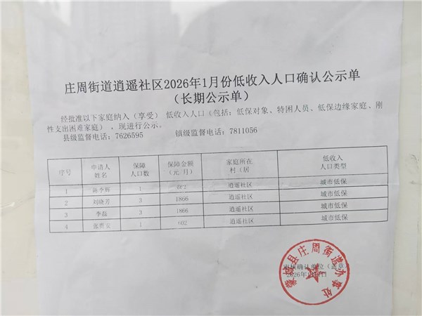 | 名称: | 庄周街道逍遥社区2026年1月份惠民惠农补贴资金发放公示情况 | 文号: | 无 |