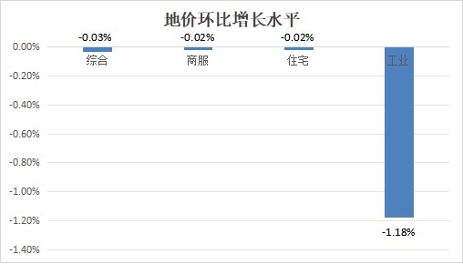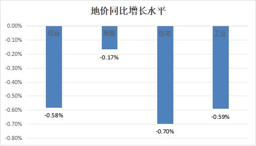 从监测结果数据来看,综合用地地价同比增长率为-0.58%,其中商服用地地价增长率为-0.17%;住宅用地地价增长率为-0.70%;工业用地地价增长率为-0.59%。商服地价水平和住宅地价水平逐步下降,工业用地地价水平与上年同期持平(详见图3)。