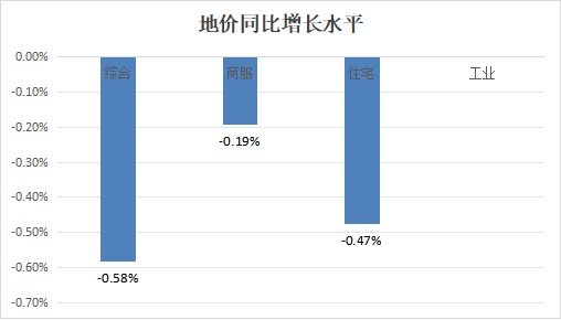 从监测结果数据来看,综合用地地价同比增长率为-0.58%,其中商服用地地价增长率为-0.19%;住宅用地地价增长率为-0.47%;工业用地地价增长率为0%。商服地价水平和住宅地价水平逐步下降,工业用地地价水平与上年同期持平(详见图3)。