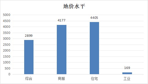 其中商服地价水平值为4177元/m2,比2025年第一季度的4178元/m2下降了1元/m2;住宅地价水平值为4405元/m2,比2025年第一季度的4406元/m2下降了1元/m2;工业地价水平值为169元/m2,比2025年第一季度的168元/m2上涨了1元/m2。各类用地地价水平环比增长率分别为:-0.02%、-0.02%、0.60%。商服、住宅、工业地价水平呈阶梯状排列,住宅地价最高,商服地价次之,工业地价最低,水平值之比为0.95:1:0.04(见图1),四季度整体地价水平状况见表1。