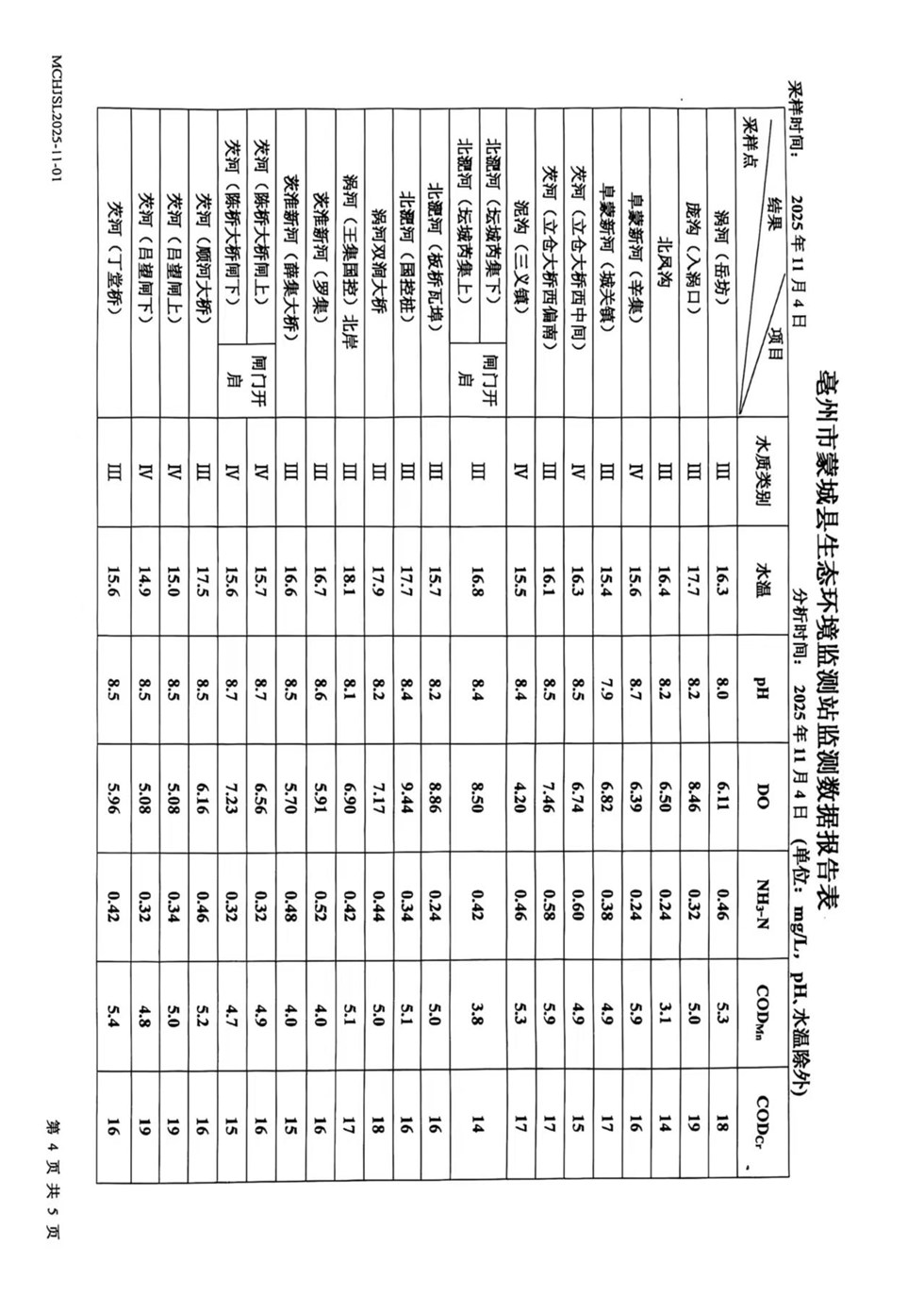 蒙城县2025年11月份水质监测断面和重点工业企业监测信息