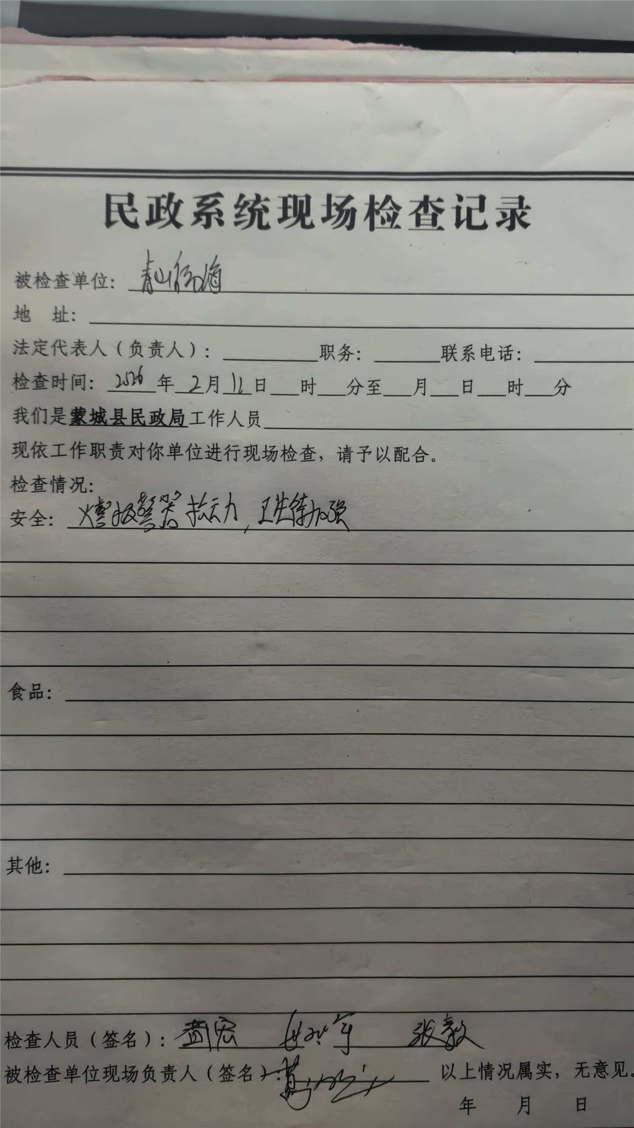 蒙城县2026年2月养老领域检查记录及整改报告
