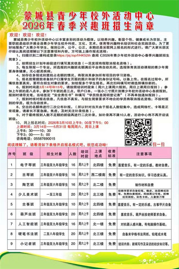 蒙城县青少年校外活动中心2026年春季兴趣班招生简章