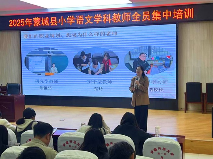 本次培训师资力量扎根本土,均来自蒙城县各学校的优秀专家教师。他们带着一线教学的鲜活经验与深度思考,围绕语文教育核心议题搭建起内容丰富的“课程矩阵”:从助力教师专业能力进阶的“成长指南”,到破解班主任管理难题的“带班方略”;从聚焦统编教材一至三年级的细致解读,到阐释“以生为本”的育人理念;既有探索阅读与写作协同发展的实践路径,也有筑牢师德师风、关注师生心理健康的温情指引。每一项内容都紧扣教学实际,既具理论高度,更含实践温度。