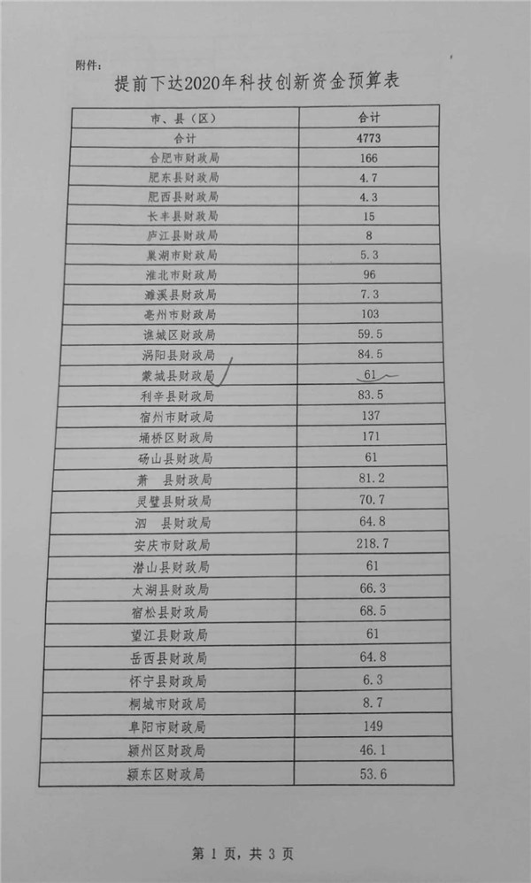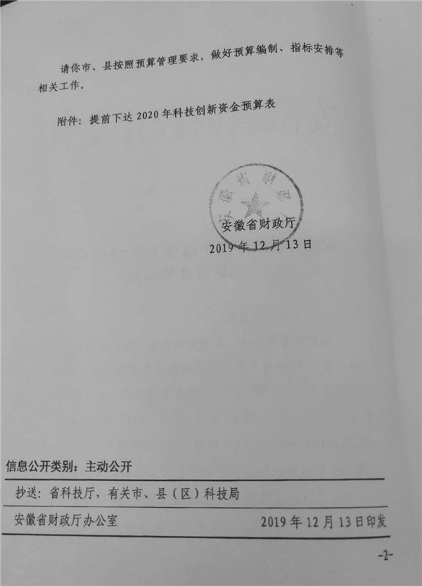 | 名称: | 安徽省财政厅关于提前下达2020年科技创新资金的通知 |