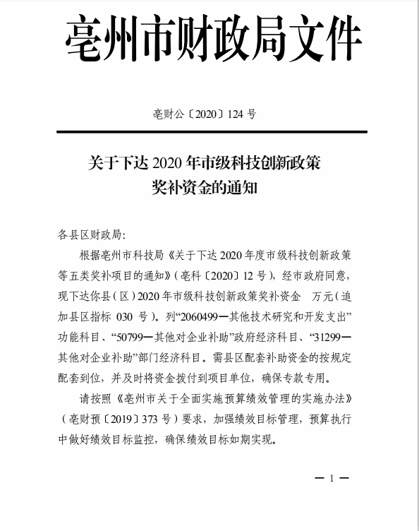 | 名称: | 关于下达2020年市级科技创新政策奖补资金的通知 | 文号: | 无 |