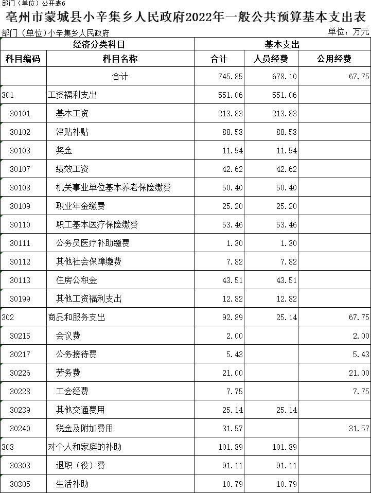 蒙城县小辛集乡人民政府 2022 年一般公共预算基本支出 748.85 万元,其中,人员经费 678.10 万元,公用经费 67.75万元。