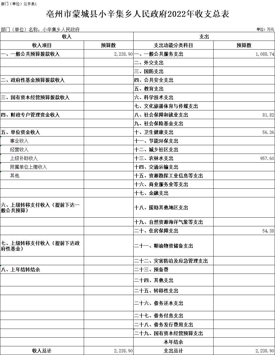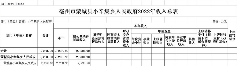 蒙城县小辛集乡人民政府 2022 年收入预算 2238.90 万元,
