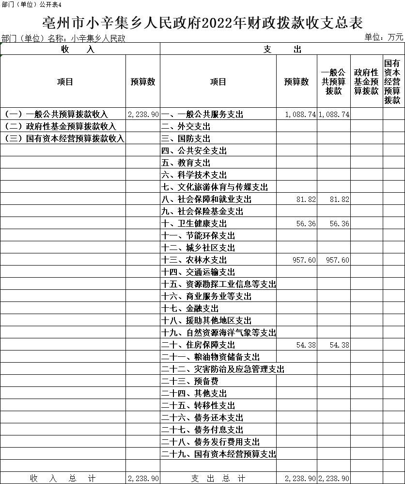 蒙城县小辛集乡人民政府 2022 年支出预算 2238.90 万元,