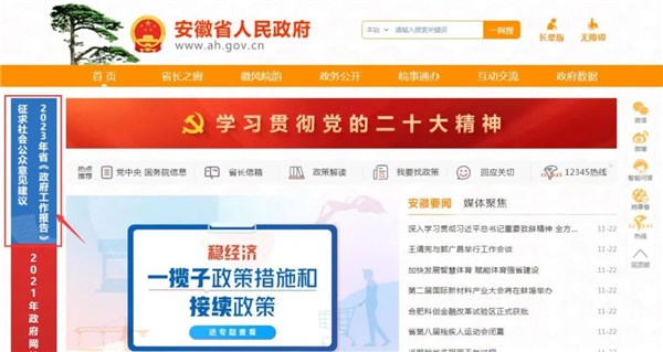 2023年是全面贯彻党的二十大精神的重要一年,是实施“十四五”规划、落实省第十一次党代会精神的重要一年,也是新一届政府履职的开局之年。为起草好2023年省《政府工作报告》,进一步问政于民、问需于民、问计于民,省人民政府继续发起“我为政府工作报告写几句”活动,公开征集社会各界对省《政府工作报告》和政府工作的意见建议,凝聚全省人民智慧共同推动现代化美好安徽建设与发展。