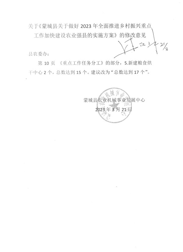 | 名称: | 关于《蒙城县关于做好2023年全面推进乡村振兴重点工作加快建设农业强县的实施方案》的修改意见 |