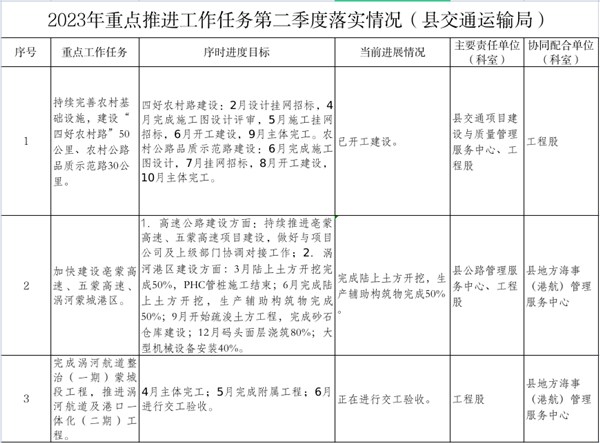 | 名称: | 2023年重点推进工作任务第二季度落实情况(县交通运输局) |