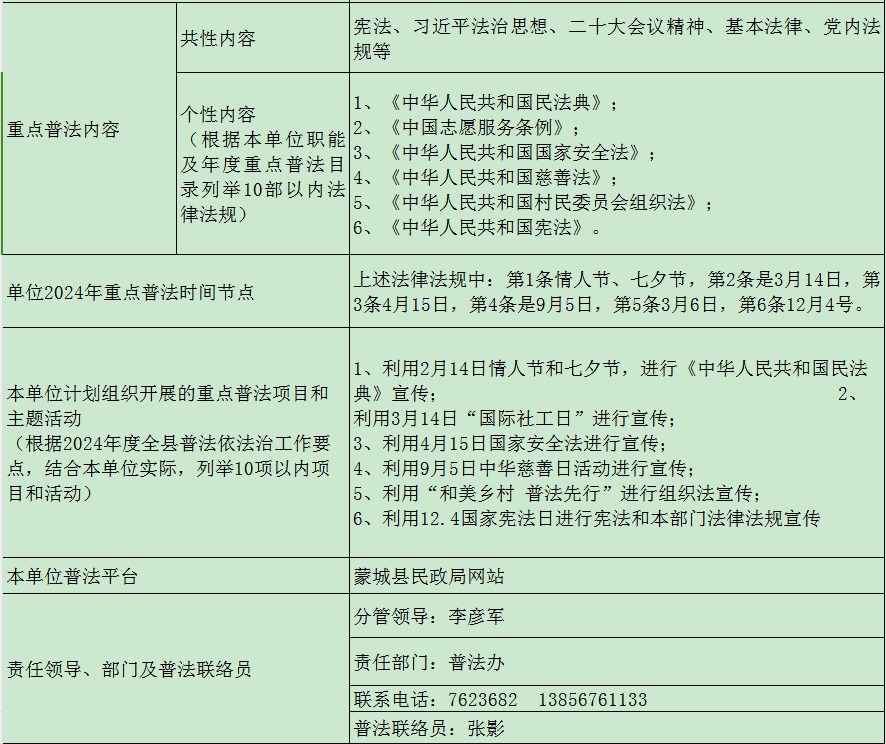 | 名称: | 2024年蒙城县民政局“谁执法谁普法”普法责任清单 |