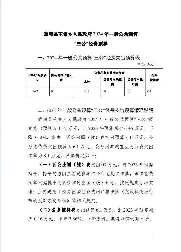 | 名称: | 蒙城县王集乡2024年“三公”经费预算安排说明及报表 |