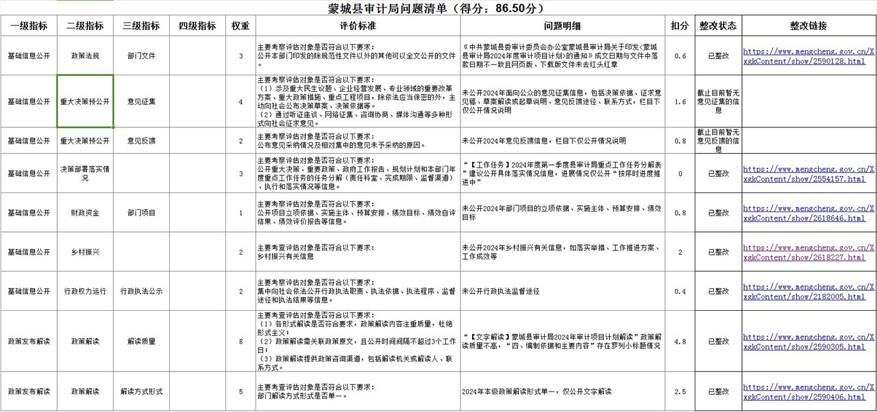 | 名称: | 【整改反馈】蒙城县审计局关于反馈2024年1-6月政务公开测评问题清单整改情况 |