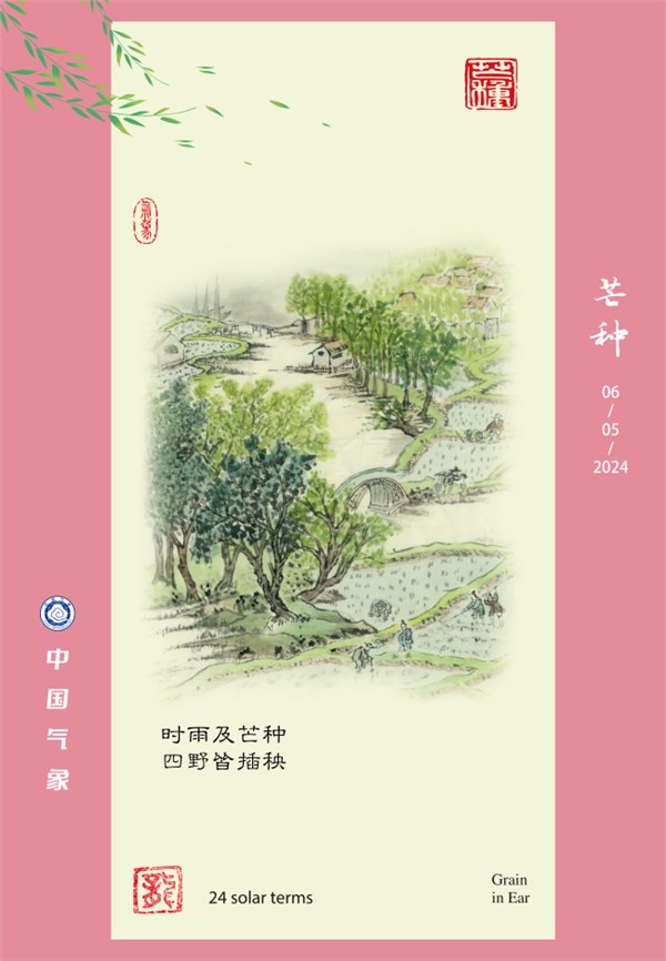 芒种节气,雨量充沛、气温升高、湿度增大,常见的灾害性天气有暴雨、冰雹、大风、干旱等。
