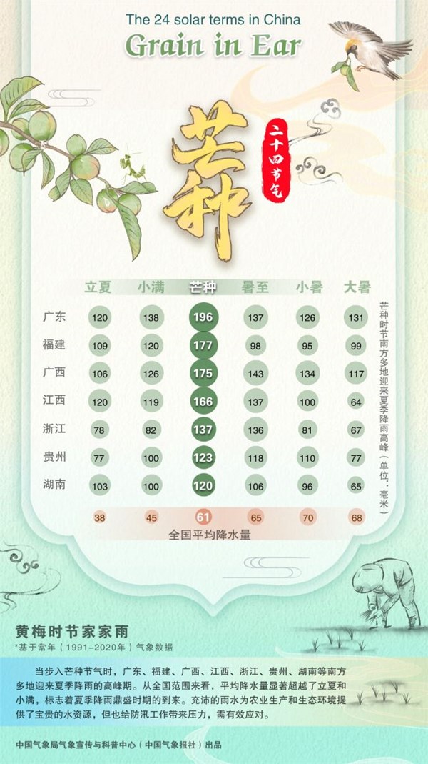 江南、江淮、长江中下游地区陆陆续续进入梅雨季节,一般持续到小暑。梅雨是冷空气强度削弱北退,暖空气北进到长江中下游地区,冷暖空气在江淮流域相峙,形成准静止锋,出现阴雨连绵的天气现象。冷暖空气交锋一段时间后,暖空气战胜冷空气,梅雨天气便结束了。宋代诗人范成大的《芒种后积雨骤冷》诗中有关于芒种期间梅雨天气的描写:“梅霖倾泻九河翻,百渎交流海面宽。良苦吴农田下湿,年年披絮播秧寒。”西南地区不仅多雨,西部高原冰雹天气的发生概率也会增大。