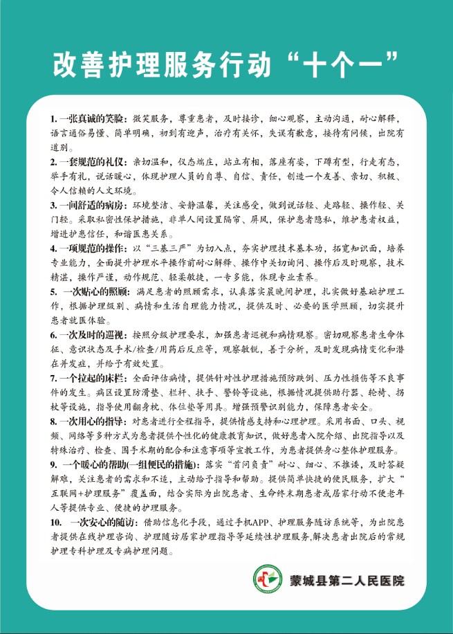 | 名称: | 蒙城县第二人民医院改善护理服务行动“十个一” |