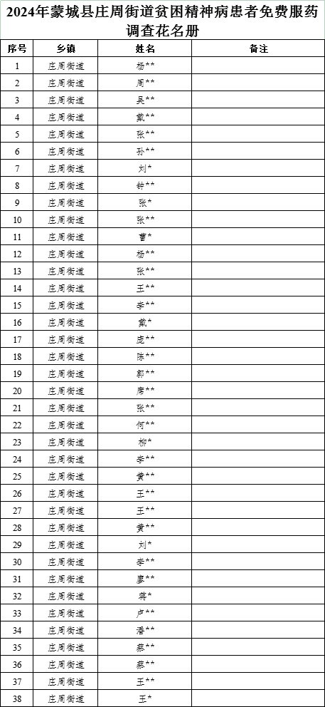 | 名称: | 蒙城县庄周街道2024年精神病人救助资金花名册 |