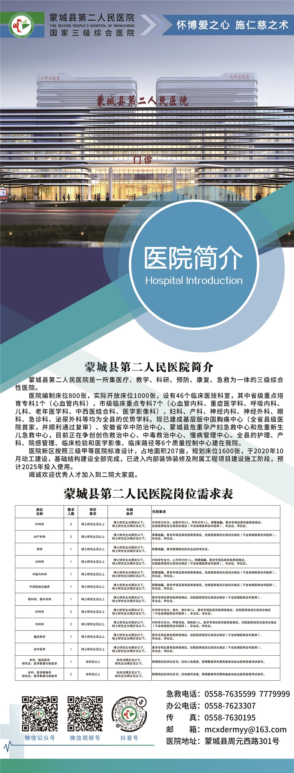 | 名称: | 蒙城县第二人民医院岗位需求表 |