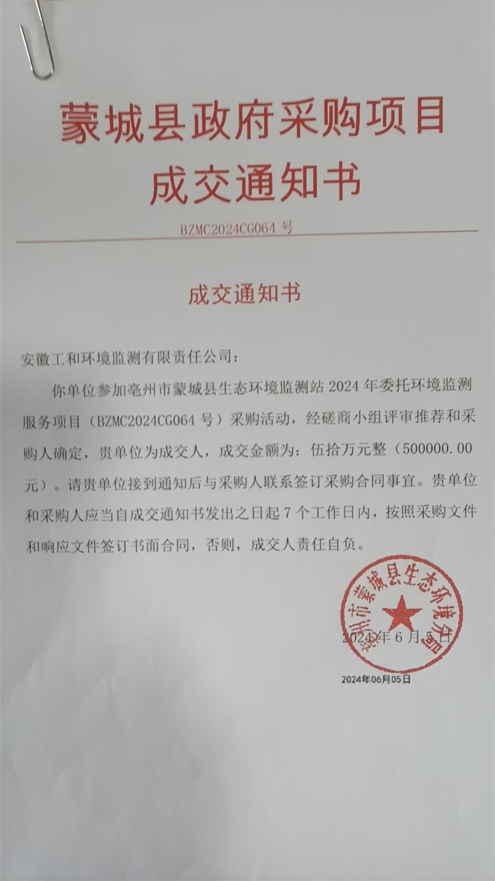 | 名称: | 蒙城县生态环境监测站2024年委托环境监测服务项目成交通知书 |
