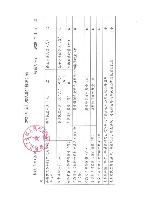 | 名称: | 立仓镇2024 年度行政执法年报统计表 |