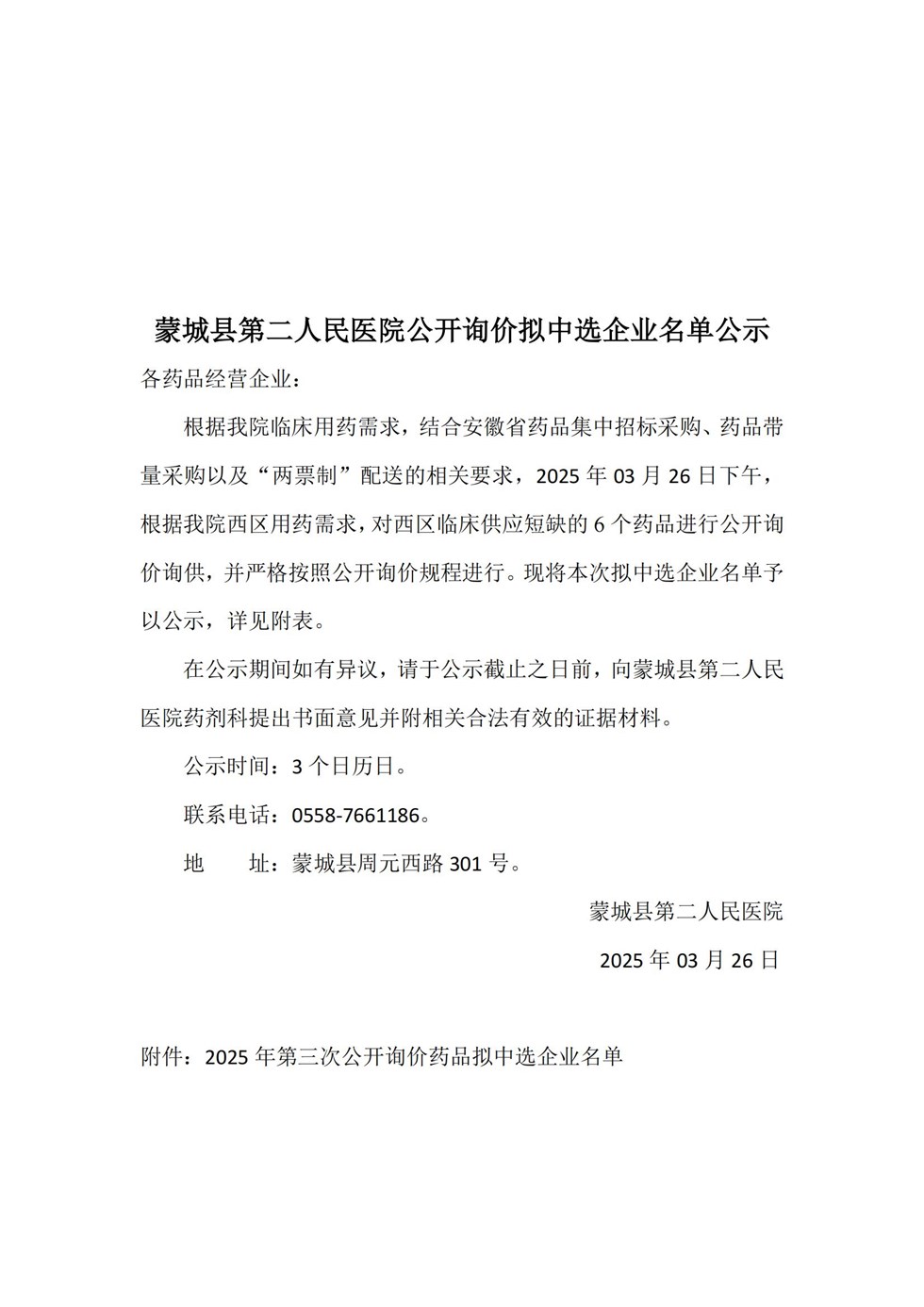 | 名称: | 蒙城县第二人民医院公开询价拟中选企业名单公示 |