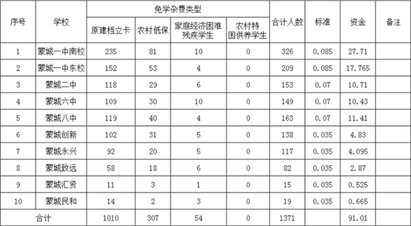 经审核汇总,全县高中学校直接免除1371人学杂费91.01万元。详情见下表:
