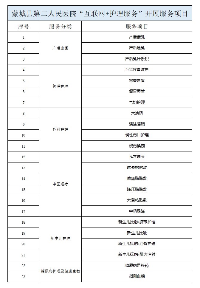 | 名称: | 蒙城县第二人民医院“互联网+护理服务”开展服务项目 |