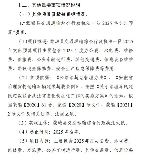 | 名称: | 蒙城县交通运输局2025年度项目立项依据、实施主体、预算安排、绩效目标信息(执法大队) |
