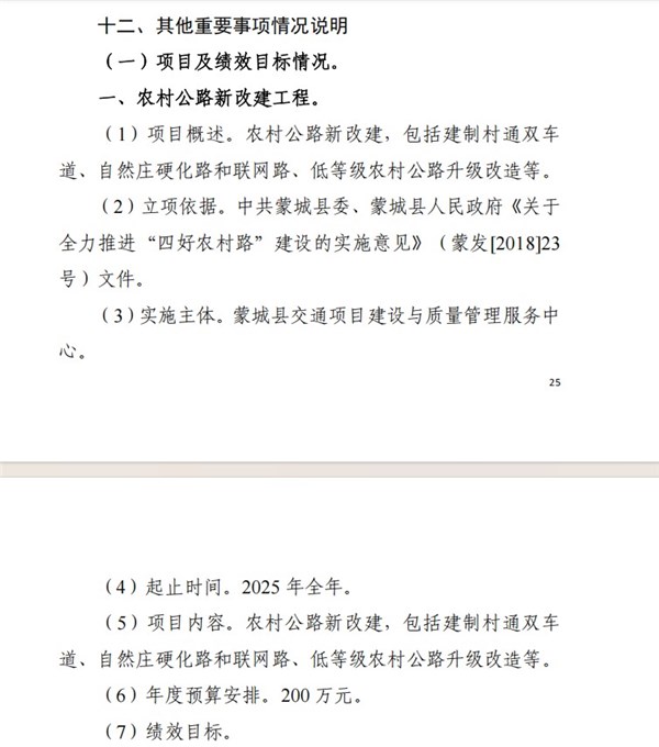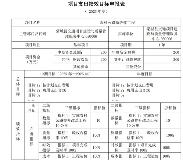 | 名称: | 蒙城县交通运输局2025年度项目立项依据、实施主体、预算安排、绩效目标信息(项目中心) |