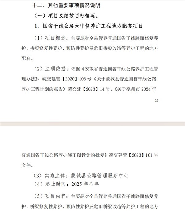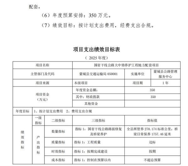 | 名称: | 蒙城县交通运输局2025年度项目立项依据、实施主体、预算安排、绩效目标信息(公路中心) |