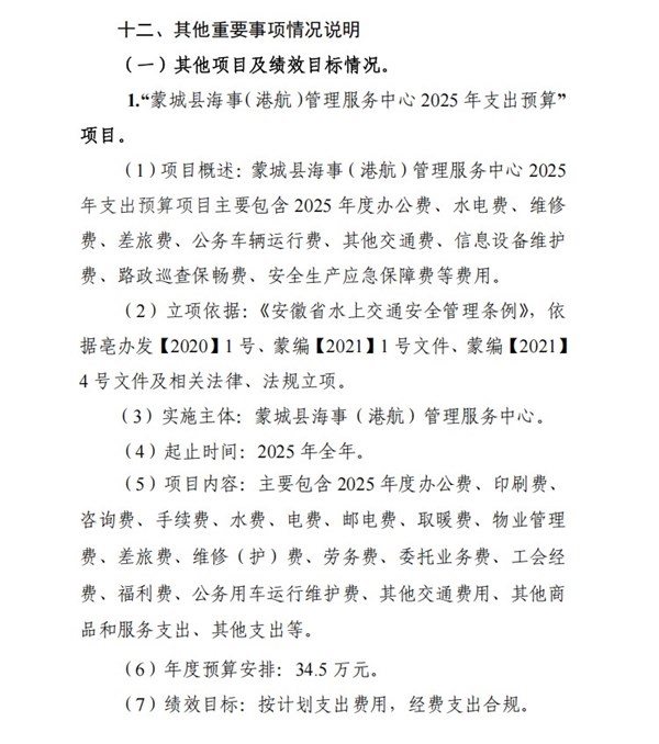 | 名称: | 蒙城县交通运输局2025年度项目立项依据、实施主体、预算安排、绩效目标信息(海事中心) |