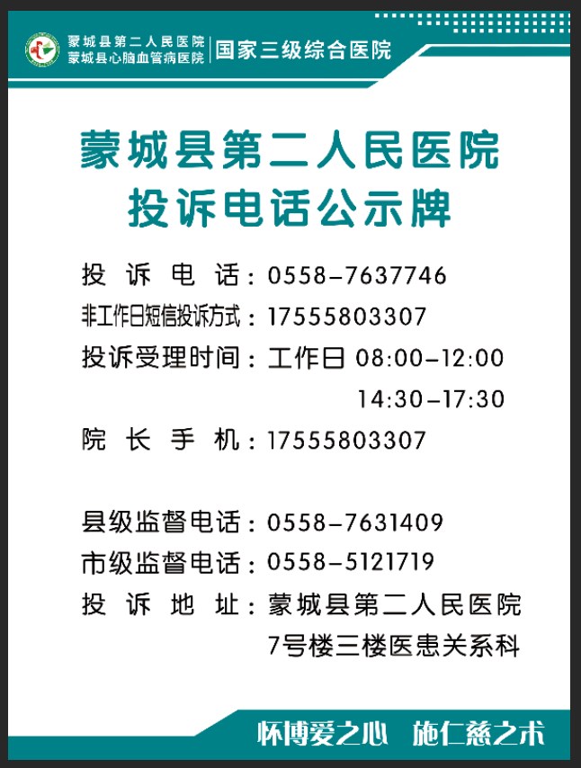 | 名称: | 蒙城县第二人民医院患者投诉信息公示牌 | 文号: | 无 |
