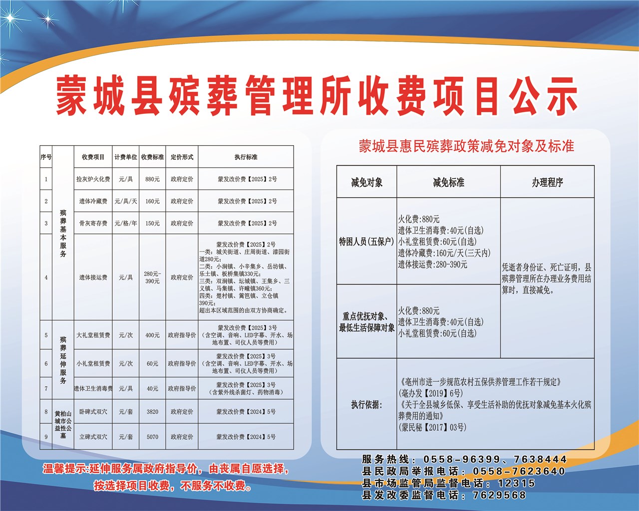 | 名称: | 【群众关切】蒙城县殡葬管理所收费项目公示 |